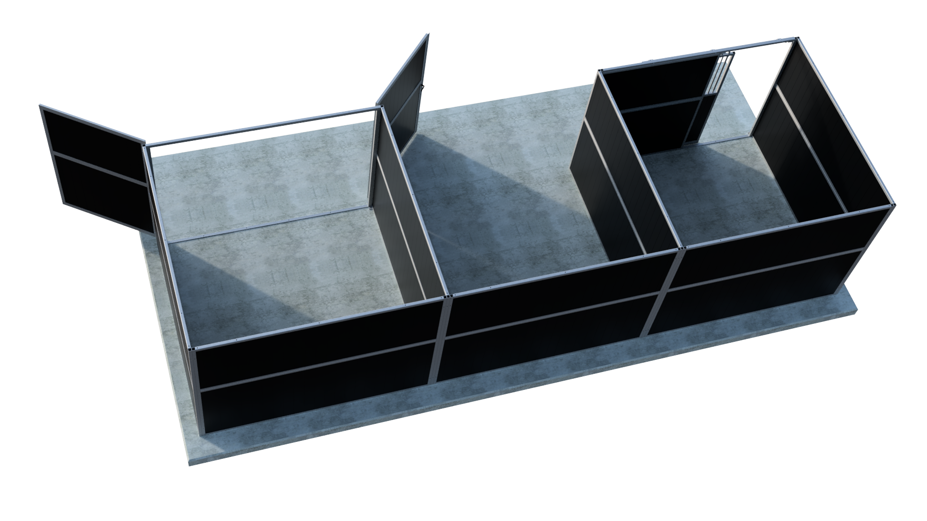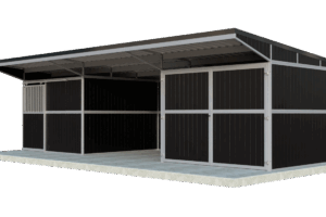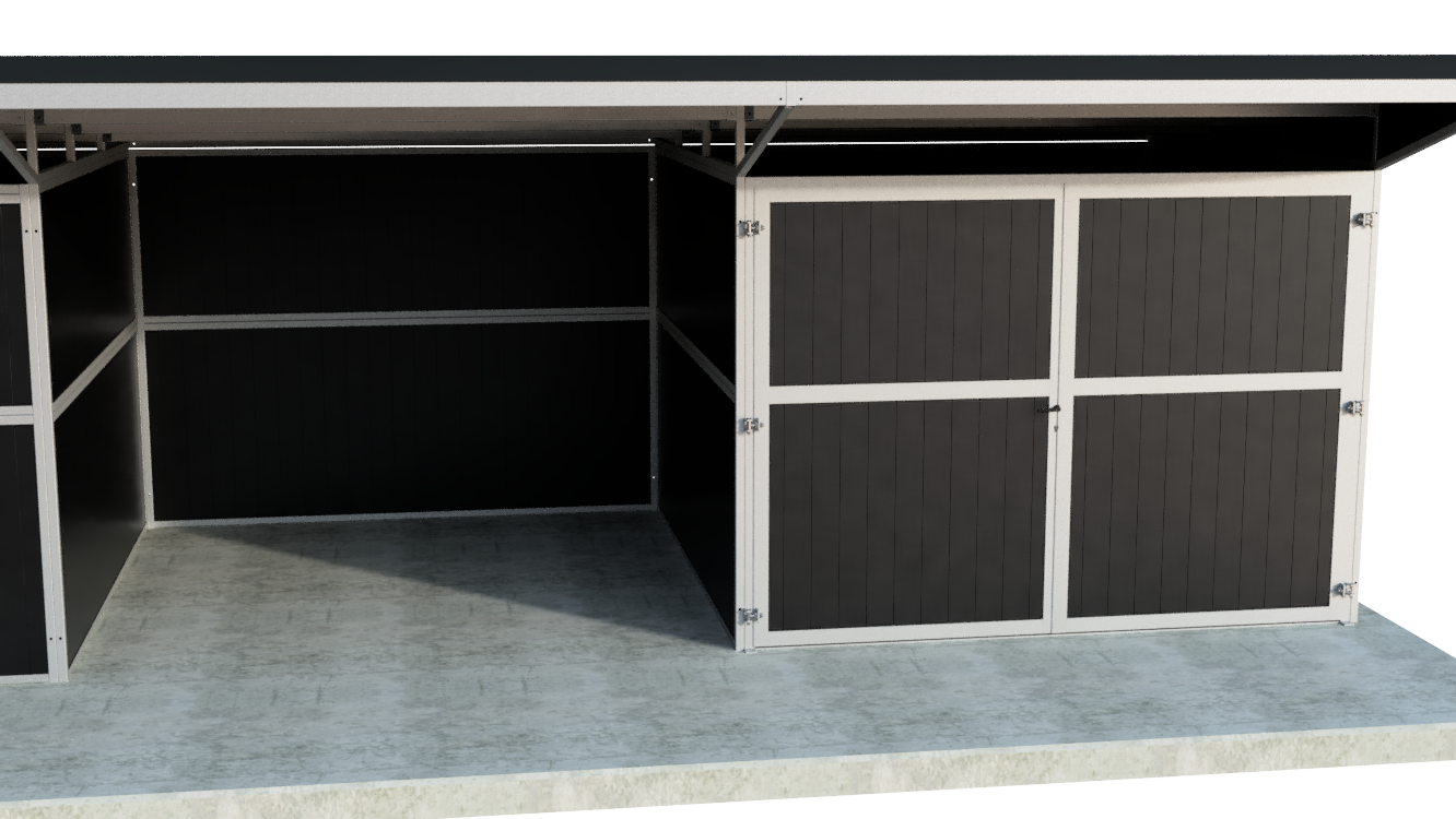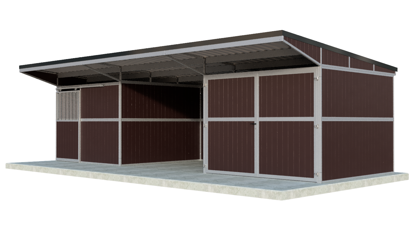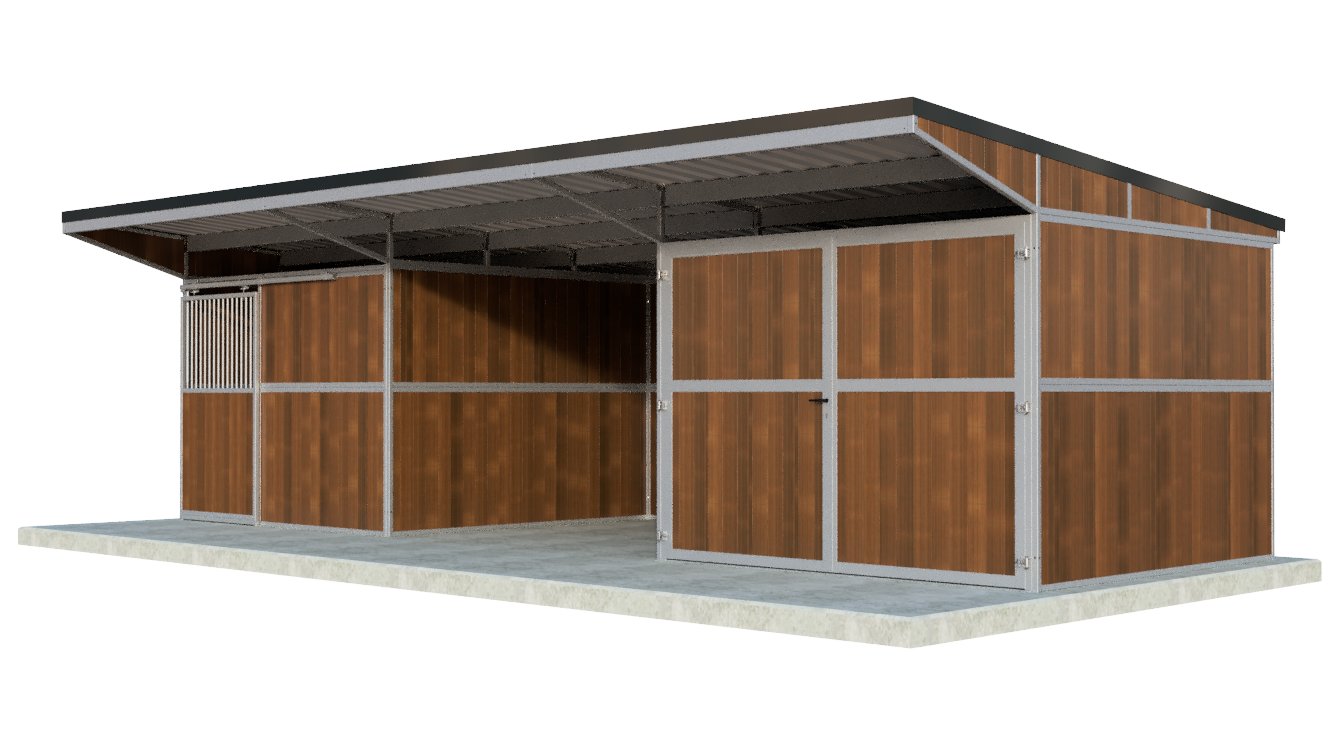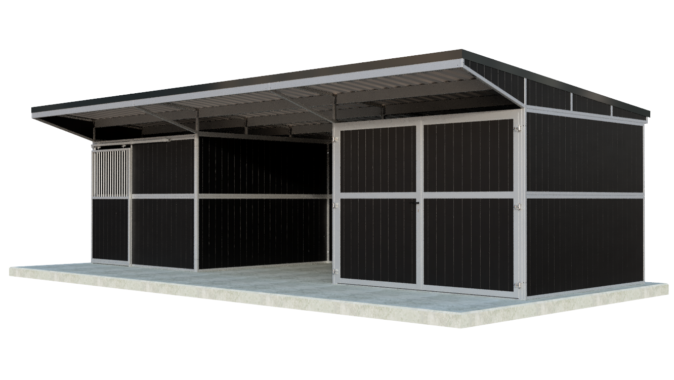Ein kompakter und äußerst stabiler Außenstall mit 1 Pferdebox mit praktischer Schiebetür, offenem Stauraum, geschlossenem Stauraum und einem Pultdach! Dieser hochwertige und vor allem funktionelle Außenstall hat 1 Pferdebox mit den Maßen 3000mmx3000mm und besteht aus einer sehr stabilen Kombination aus feuerverzinktem Stahl und wahlweise schwarzen/braunen Kunststoff- oder Bambusplatten. Etwas ändern oder hinzufügen? Die Möglichkeiten sind endlos!