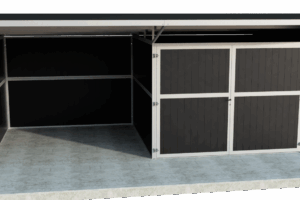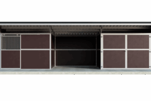 Die Frontwand dieses Pferdestalls hat eine praktische Schiebetür. Es ist jedoch zu beachten, dass die Rückseite des Stalls dem Wind zugewandt ist, um Zugluft an der Vorderseite zu vermeiden. Dieser Stall ist serienmäßig mit schwarzen oder braunen Kunststoffplatten (32 mm) ausgestattet, die sehr robust und leicht zu reinigen sind, z. B. durch Besprühen mit einem Hochdruckreiniger.