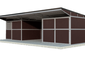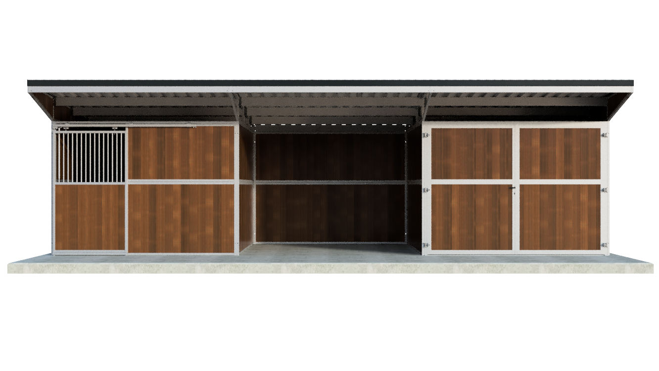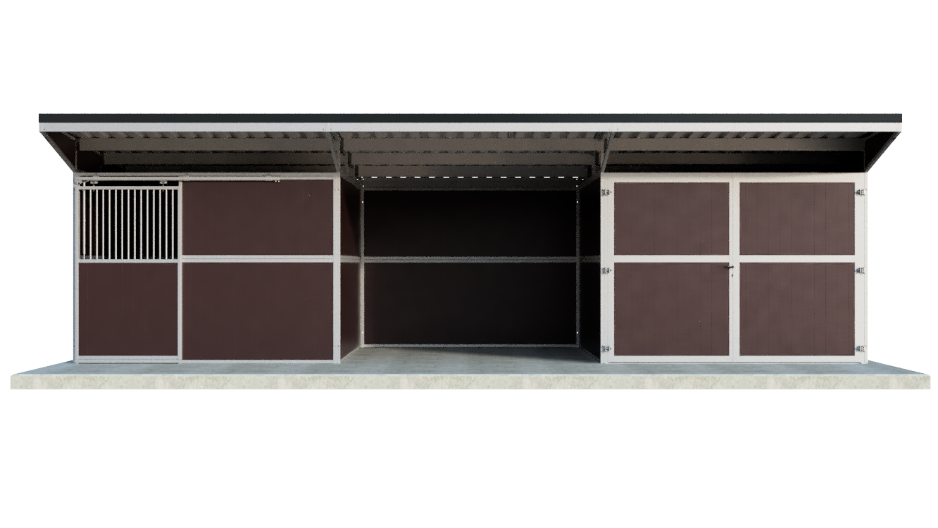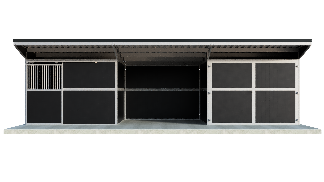 Home1 Pferdestall mit Schiebetür, offenem und geschlossenem Lagerraum – Pultdach