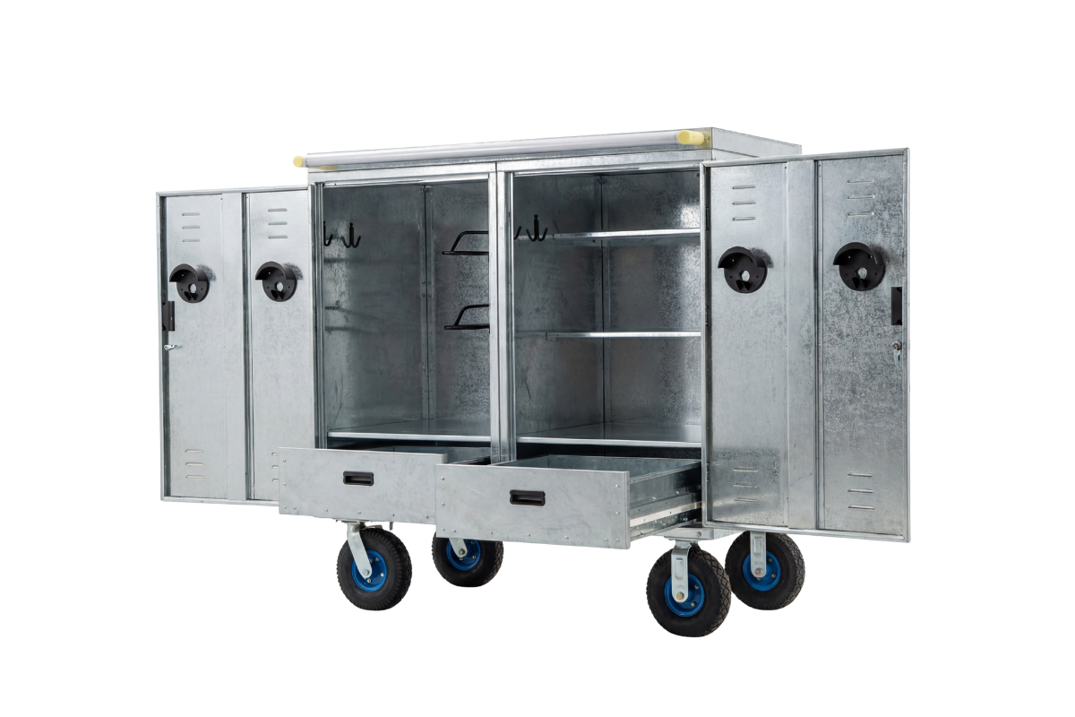 Der fahrbare Turnierschrank XL von Mulder Stall und Hof kombiniert maximale Stabilität mit durchdachter Funktionalität. Dank feuerverzinktem Stahl, großzügigem Stauraum und leichtgängiger Mobilität ist er die ideale Lösung für Reiter, die ihre Ausrüstung sicher, strukturiert und jederzeit griffbereit aufbewahren möchten, ob im Turniereinsatz oder im täglichen Stallbetrieb.