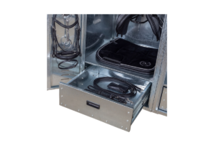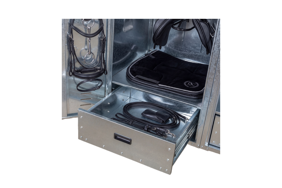 Der Schrank ist vollständig aus feuerverzinktem Stahl gefertigt und damit dauerhaft gegen Korrosion geschützt, ideal für den regelmäßigen Außeneinsatz oder feuchte Sattelkammern. Weiche, abgerundete Kanten sorgen dafür, dass Ihre Ausrüstung unversehrt bleibt. Zusätzlich ist das Modell XL komplett nagersicher, sodass wertvolle Ausrüstung sicher und geschützt gelagert werden kann.